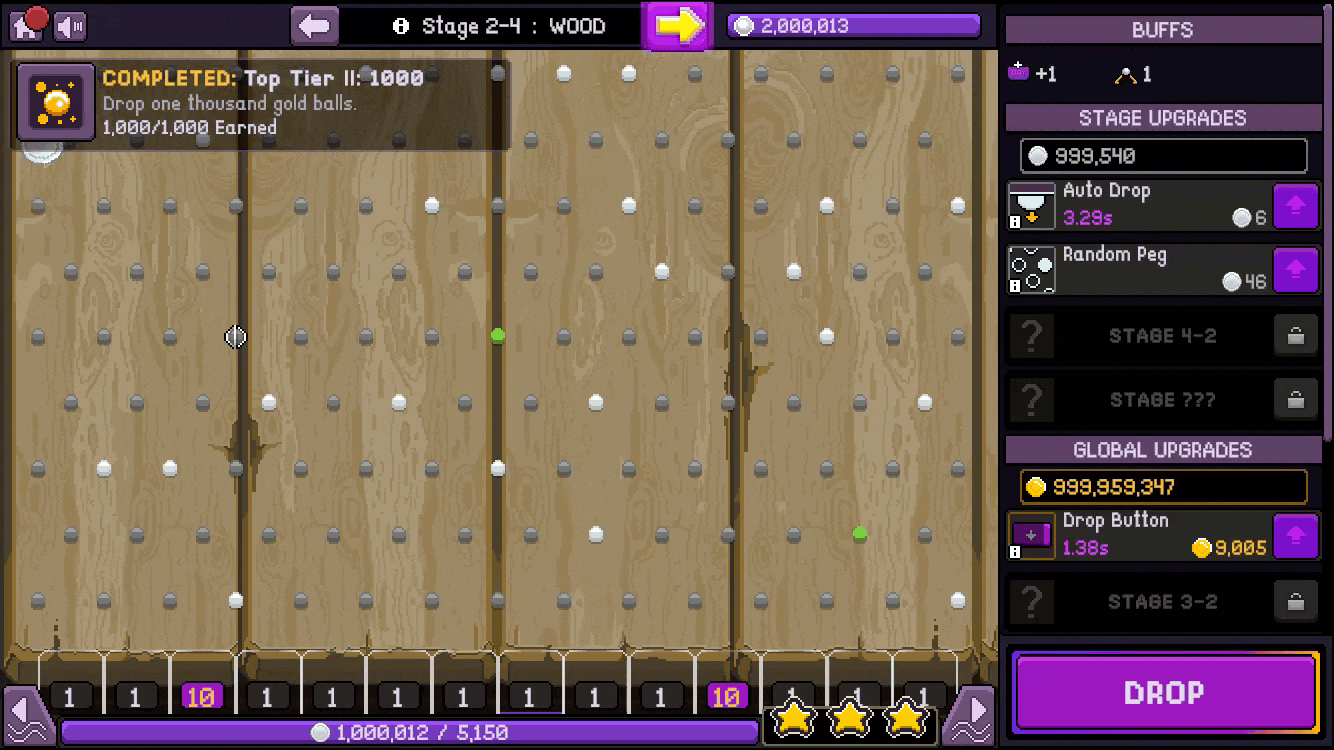 The solution was to add features, carefully and without breaking the game. The features had to play nice with the Plinko and scale with the incremental nature of the game. In short, gamification of Plinko and gamification of the idle game component.